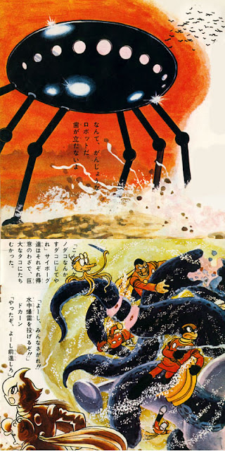Found in a MANDARAKE store in Tokyo by Tim "Starblazers.com" Eldred, this CYBORG 009 Asahi Sonorama single is, if you happen to be my brain, something that is constantly playing in the background at all hours of the day or night. I'm a big CYBORG 009 fan. I like the cartoony big-foot Shotaro Ishinomori style, I like the angsty, turned-into-fighting-cyborgs-against-our-will story, I like the bizarre monster combination enemy cyborgs they're thrown against, and most of all I like the fact that American fans of the show are thin on the ground so there isn't a lot of competition when it comes to grabbing CYBORG 009 toys or books at the anime cons (not that there's a lot of 009 stuff at anime cons these days).